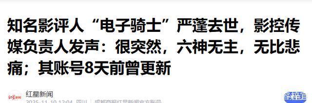 本文信源来自权威报道【新浪微博】【红星新闻】【百度百科】【中国新闻网】(详细信源附在文章末尾)。为提升文章可读性,细节可能存在润色,请理智阅读,仅供参考! 永远的“电子骑士” 很多人对严蓬这个名字感到陌生, 但要提起他的网名, 估计许多网友都会恍然大悟。 他在网络上活跃的时候, 通常以“电子骑士”的名字示人, 经常出没于各大影视剧的评论区,言语犀利、点评专业, 光是微博就圈粉将近180万。